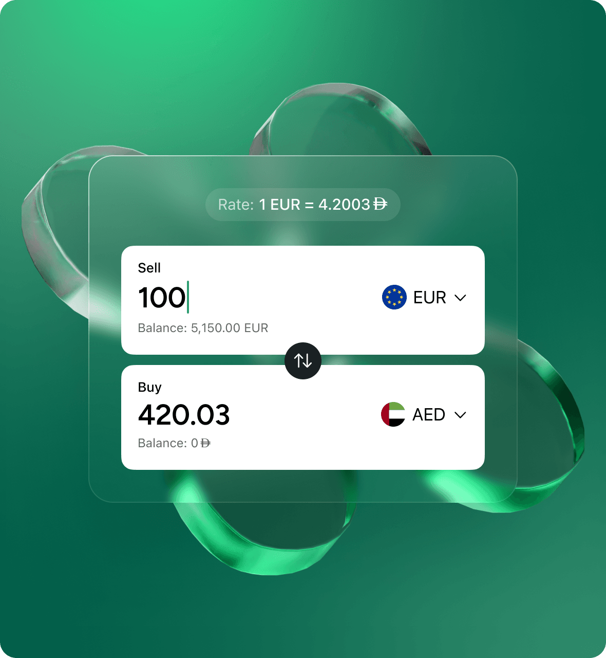 Real-time conversion with rates confirmed at the moment of transaction.